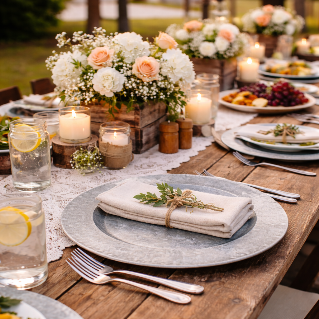 Create country or farmhouse look for your wedding or event by placing your plates on top of one of these rustic galvanized chargers that has a neutral silver hue that pairs easily with a variety of place settings.