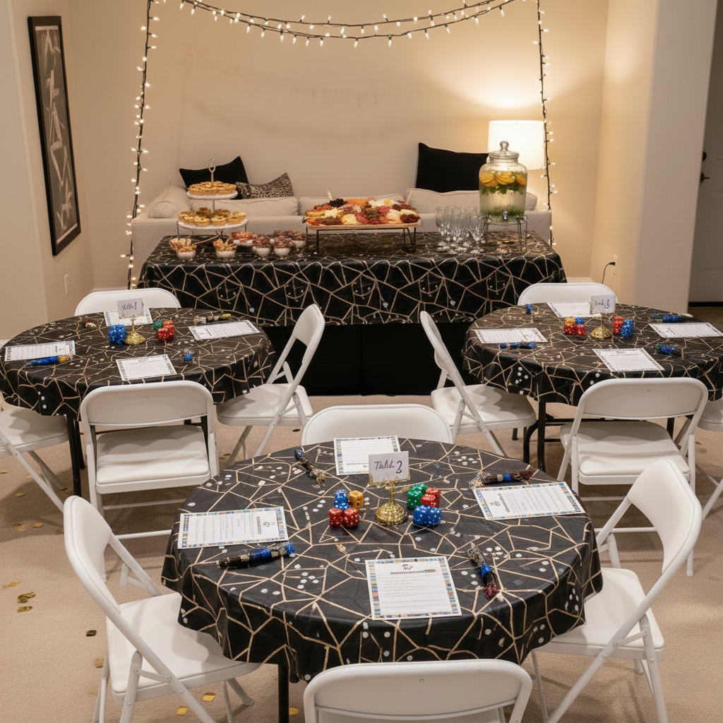 • Complete Gaming Setup: We provide all the necessary Bunco supplies for up to 12 players, including dice, scorecards, table markers, and detailed instructions. We also supply the essential furniture: tables, tablecloths, and seating for every guest.