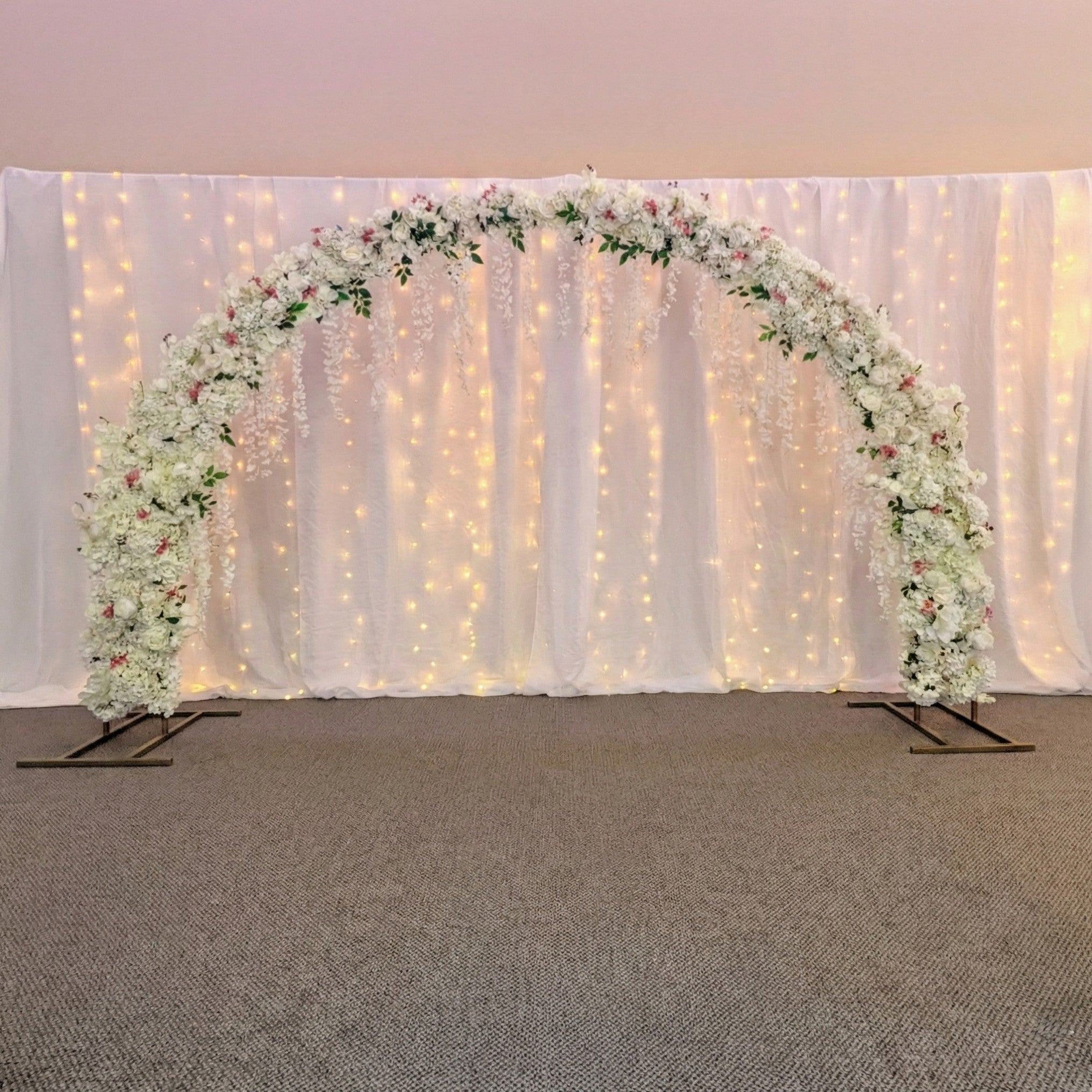 Indoor Grandeur: This piece is a favorite for indoor receptions or chapels. It frames large windows or stage areas perfectly, bringing the beauty of an outdoor garden inside.